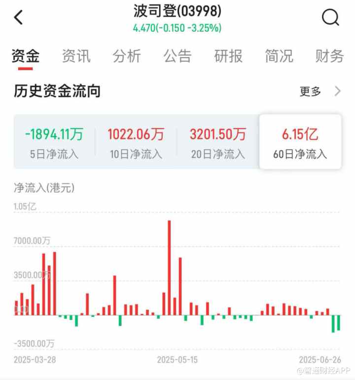 基于良好的经营表现,波司登宣派末期股息每股普通股22港仙。此外,波司登股票投资价值也受到投资者认可。近期,公司股价一度上涨至4.79港元年内高点,年内最大涨幅达到23.5%。智通财经APP数据显示,截至6月26日近60个交易日,波司登获得6.15亿港元资金净流入。