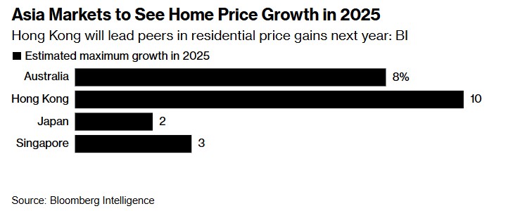 根据BI的一份最新报告,除了香港,新加坡、澳大利亚和日本的整体房屋价格在2025年都将变得更加昂贵。尤其对于中国香港来说,这些数据扭转了香港房价多年来的下跌趋势,包括Ken Foong在内的分析师表示,房价可能会攀升高达10%。澳大利亚的住宅价格则有望上涨7%至8%,而新加坡和日本的房价预计将分别温和增长3%和2%。