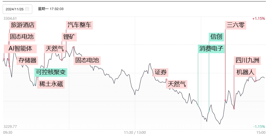 受到年轻群体的强劲消费能力加持下,谷子经济概念核心龙头泡泡玛特第三季度营收实现翻倍增长,其股价今日一度涨超6%,创2021年3月来新高,总市值逼近1200亿港币。谷子经济概念今日全面迎来爆发,广博股份、实丰文化、贝仕达克、金运激光实现连板晋级,奥飞娱乐、华立科技也早早封死涨停。由于板块内不少个股叠加有AI陪伴、AI机器人等概念,因此该板块的补涨也可视为整个AI应用端的低位补涨,在多重因素叠加下,板块迎来全面高潮之际短期继续追涨需保持适当谨慎。