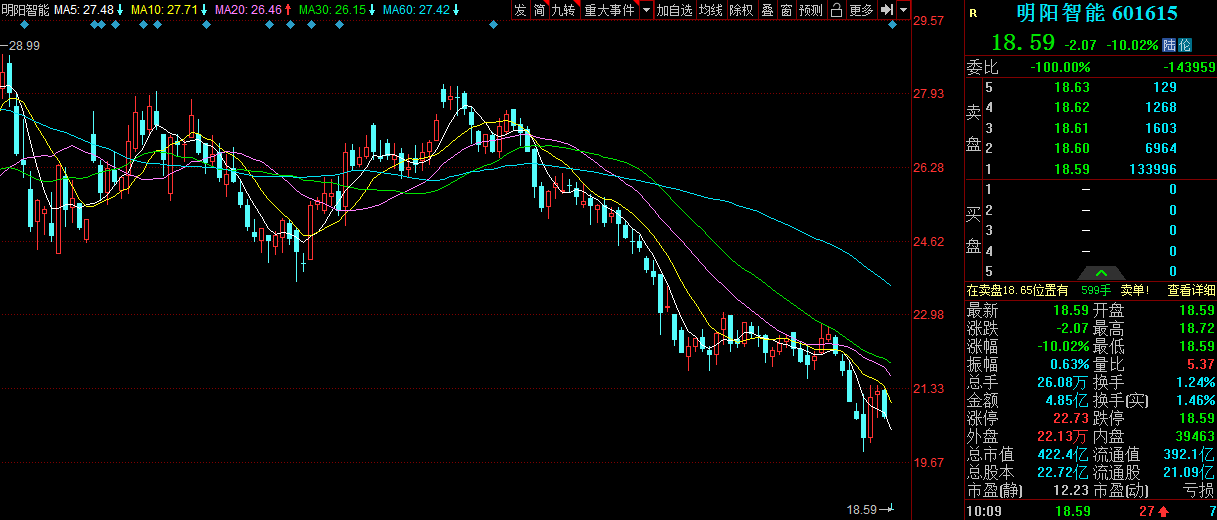 5月4日,明阳智能开盘触及跌停,该股曾一度打开跌停,此后又封上跌停板,截至发稿,明阳智能报18.59元,跌10.02%,成交额4.85亿元。
