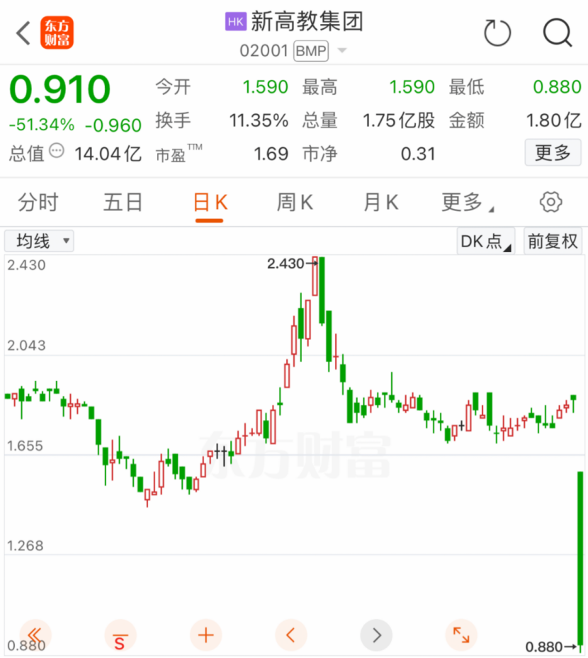 11月29日,港股开盘后,新高教集团(02001.HK)股价大幅跳水,暴跌超51%,创出历史新低,截至收盘跌幅达51.34%,报0.91港元/股,总市值跌至14.04亿港元。