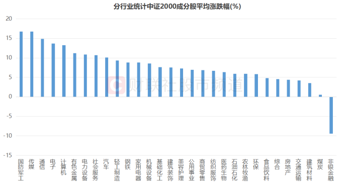值得注意的是,小微盘指ETF本月也相对绩优,有6只登上本月涨幅居前的20只ETF榜单,其中,银华基金管理的2000增强ETF月涨幅超10%。以中证2000成分股统计,国防军工板块个股平均上涨近16.8%,位居首位,其次便为TMT四大板块,其中,传媒、通信、电子、计算机板个股平均上涨16.7%、14.8%、13.7%、13.3%。整体来看,TMT股对小微盘指的“贡献”也较大。