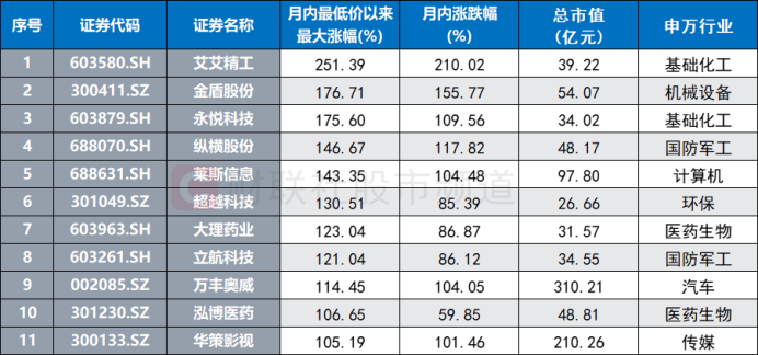 本月以来,市场热点题材频出,低空经济、AI应用、算力、高速铜缆、有色金属等多个方向一度爆发,并带动相关概念股大幅上涨。截至今日收盘,不计算本月新股,月内累计共有11股一度录得翻倍行情(区间最低价至最高价涨幅超100%)。一般来说,翻倍股常代表市场高热方向,而今日传媒股入围“翻倍大军”,也代表市场资金对传媒方向的关注度大幅提升。