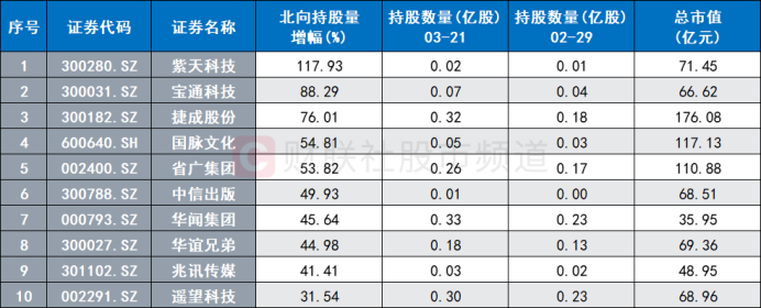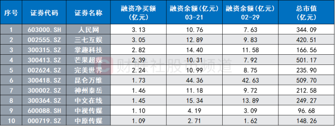 此外,不少传媒股本月也获北向资金和融资资金大举增持。具体数据上看,截至3月21日,紫天科技、宝通科技、捷成股份、国脉文化、省广集团月内北向持股量增幅明显,其分别达118%、88%、76%、55%、54%。融资资金方面,人民网、三七互娱、掌趣科技、芒果超媒、完美世界获融资客重点加仓,净买额分别达3.1亿元、3.1亿元、2.8亿元、2.4亿元、2.2亿元。