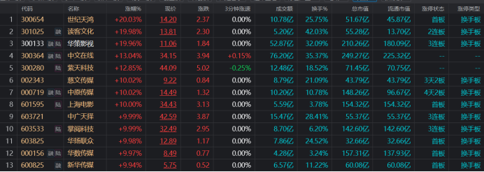 本月翻倍股又添一员!“传媒牛”20cm3连板,TMT频聚赚钱效应,这些方向热度也高