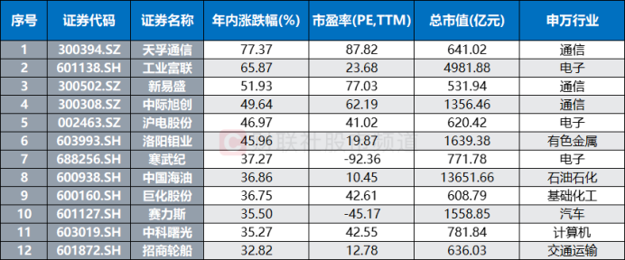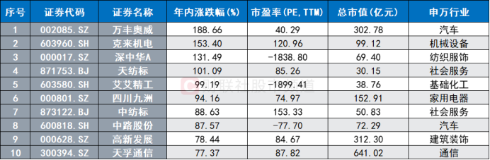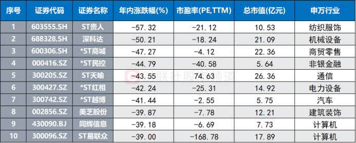 目前,A股平均下跌近7.9%,虽然已有1200余股成功实现年内收涨,但仍有4100股处于“转正之旅”。具体个股来看,万丰奥威、克来机电、深中华A、天纺标、艾艾精工年内涨幅居前,若筛选市值超500亿元的权重股,天孚通信、工业富联、新易盛、中际旭创、沪电股份涨幅居前。而ST贵人、深科达年内深跌并股价腰斩,*ST商城等股也表现不佳。