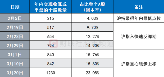 3月20日讯(编辑 梓隆),近日,各大指数维持震荡走势,但个股“转正率”仍继续上升。截至今日(3月20日)收盘,不计算今年上市新股,目前已有1230股年内实现“转正”(收涨或平盘),占比整个A股的23.1%,同时,其“转正率”较之上月末(2月29日)和此前沪指年内低点时刻(2月5日)均有明显改善。