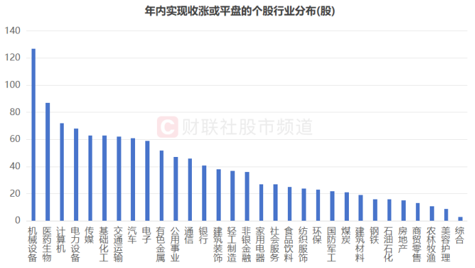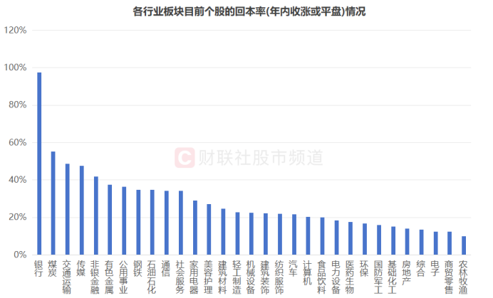 分板块统计,目前已“转正”的近1200股中,机械设备、医药生物数量明显较多,计算机、电力设备、传媒股数量也相对居前,而综合、美容护理、农林牧渔股相对较少。若考虑同行业个股的转正情况,目前,银行板块“转正率”最高,板块内近98%的个股年内收涨或平盘,煤炭、交通运输、传媒板块整体“转正率”也较高,而农林牧渔、商贸零售、电子板块年内收跌股占比居前。