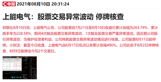 8月10日,储能概念龙头上能电气复牌仅2个交易日“二进宫”。此外,昨日包括易事特、中天科技和四方股份在内的多家涉及储能概念的上市公司纷纷发布股价异动公告,称公司储能业务规模较小。