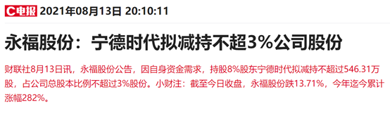 消息面上,永福股份今日盘后公告,因自身资金需求,持股8%股东宁德时代拟减持不超过546.31万股,占公司总股本比例不超过3%股份。