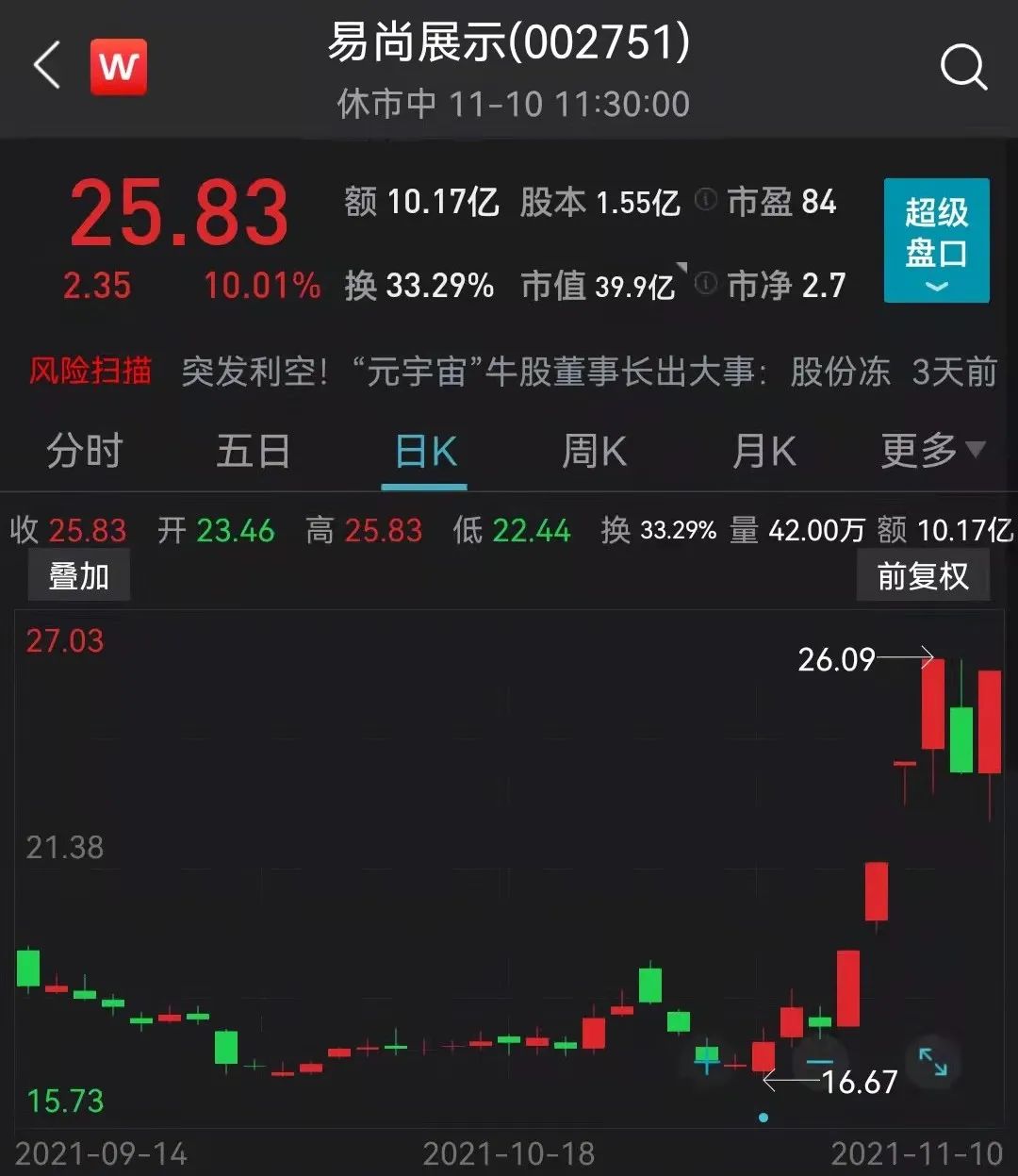 值得注意的是,收到关注函的易尚展示,在昨日跌停后,10日上午竟然急拉涨停。截至10日午盘,易尚展示触及涨停,报25.83元/股,实现6天5板。