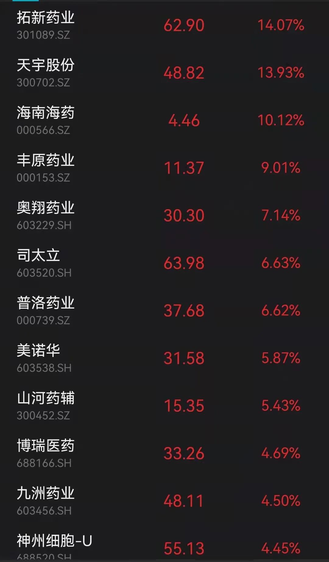 10日上午,医药制造板块大涨。其中,拓新药业上涨14.07%,天宇股份上涨13.93%,海南海药涨停,丰原药业上涨9.01%。