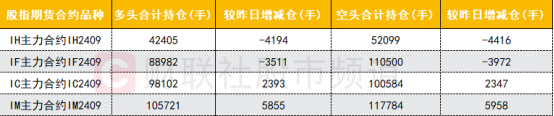 四大期指主力合约中,IH、IF多空双方均大幅减仓,且空头减仓数量均较多;IC、IM合约多空双方均大幅加仓,加仓数量均基本相当。