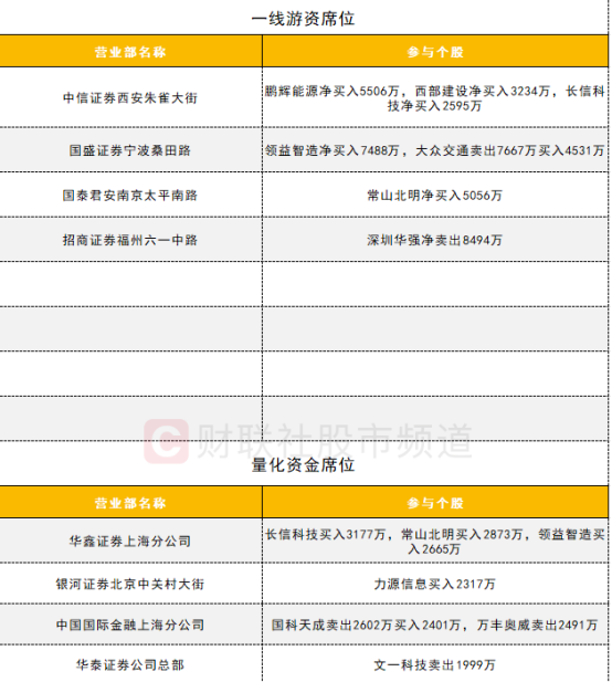 一线游资活跃度明显下降,固态电池概念股鹏辉能源获中信证券西安朱雀大街营业部买入超5000万;折叠屏概念股领益智造获国盛证券宁波桑田路营业部买入超7000万;今日断板的深圳华强遭招商证券福州六一路营业部卖出超8000万。