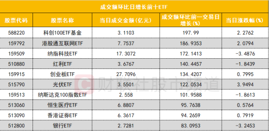 从成交额环比增长前十的ETF来看,科创100ETF基金(588220)成交额环比增长197%位居首位;纳指科技ETF(159509)成交额环比增长172%位居第三位;创业板指ETF(159915)成交额环比增长134%位居第五位。