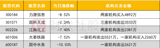 卖出方面,次新股国科天成遭机构卖出超3000万;大秦铁路遭机构卖出超5000万。