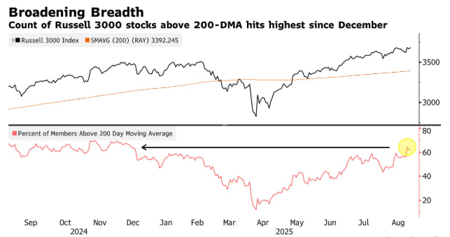 除了大盘股之外,投资者对小盘股的信心也在不断增强,这为美股在通常表现较为疲软的月份到来之前提供了至关重要的支撑力量。数据显示,超过 64% 的罗素 3000 指数成分股的交易价格已高于其 200 日移动平均线,这一比例是自去年 12 月以来的最高水平。而Oppenheimer技术策略师所收集的数据表明,当该指标降至 60% 以下时,市场往往会出现峰值。