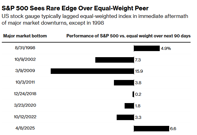 尽管市场整体表现已显示出显著的改善迹象,但仍有进一步提升的空间。自 4 月 8 日的低点以来,标普500 指数已上涨了 30%,而其等权重指数同期涨幅为 23%。