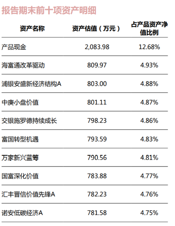 截至二季度末,宁耀权益类全明星FOF策略开放式产品1号以成长风格为主,持仓基金包括海富通改革驱动、浦银安盛新经济结构A、中庚小盘价值、交银施罗德持续成长等。