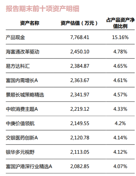宁耀权益类优质成长FOF策略开放式产品2号在持有海富通改革驱动、易方达科汇、富国内需增长A等偏成长风格基金的基础上,还配置了医药、消费等价值风格基金,包括中欧消费主题A、中庚价值领航、交银医药创新A等。