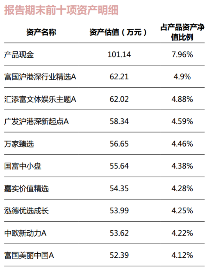 宁耀权益类稳健价值FOF策略开放式产品3号持仓风格较为均衡,包括富国沪港深行业精选A、广发沪港深新起点A、万家臻选等。