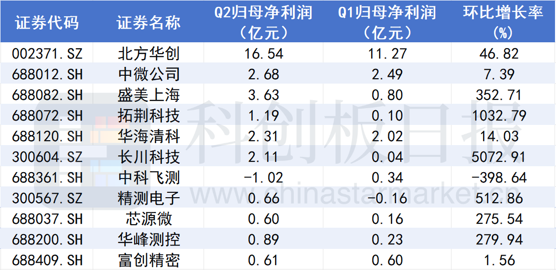 单从第二季度表现来看,有10家公司均实现净利润环比增长,其中6家公司环比增超1倍。另外值得注意的是,上述半导体设备厂商中,北方华创、华海清科、长川科技3家公司,其第二季度净利润皆创下了单季度历史新高。