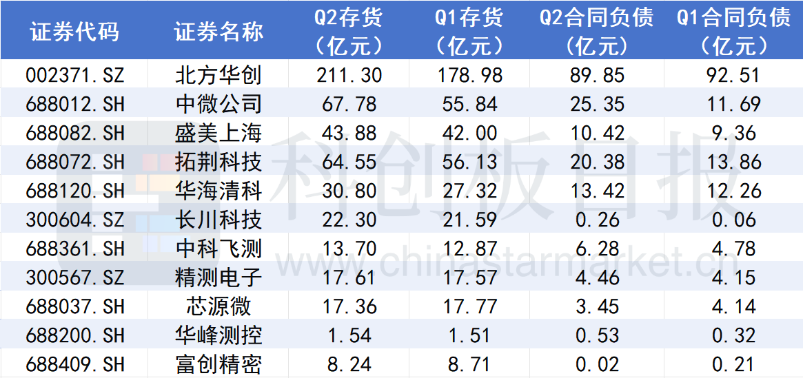 从存货和合同负债来看,有8家公司两项指标均实现环比增长。其中,中微公司、盛美上海、拓荆科技、华海清科四家公司增长尤为明显,具体而言,其第二季度合同负债依次为25.35亿元、10.42亿元、20.38亿元、13.42亿元,环比第一季度增长116.86%、11.28%、46.98%、9.48%;存货依次是67.78亿元、43.88亿元、64.55亿元、30.8亿元,环比增长21.39%、4.48%、15%、12.77%。