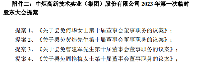 中炬高新7日晚间公告称,拟于24日召开2023年第一次临时股东大会,审议罢免何华、黄炜、曹建军、周艳梅等四人董事职务,并选举梁大衡、林颖、刘戈锐、刘锗辉为公司非独立董事的议案。