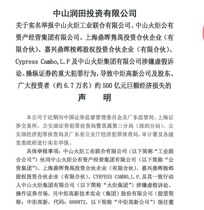 7月12日,中山润田在宝能集团官网发表声明进行回击,同时举报火炬集团等国资股东涉嫌虚假诉讼、操纵证券市场,导致中炬高新公司及股东、广大投资者约500亿元巨额经济损失。