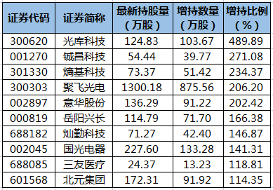 其中,持股量环比增幅在100%以上的共有14只,环比增幅最大的是光库科技,陆股通最新持有124.83万股,持股量环比增幅达489.89%。