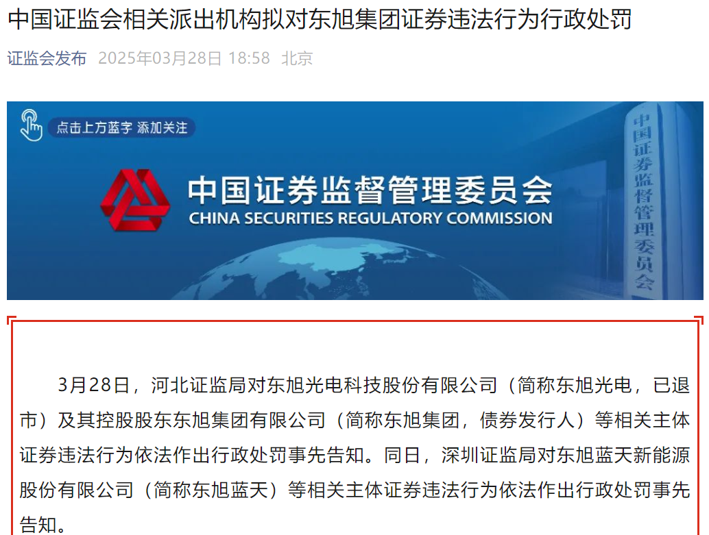 今日,河北证监局对东旭光电科技股份有限公司(简称“东旭光电”,已退市)及其控股股东东旭集团有限公司(简称“东旭集团”,债券发行人)等相关主体证券违法行为依法作出行政处罚事先告知。同日,深圳证监局对东旭蓝天新能源股份有限公司(简称“东旭蓝天”)等相关主体证券违法行为依法作出行政处罚事先告知。
