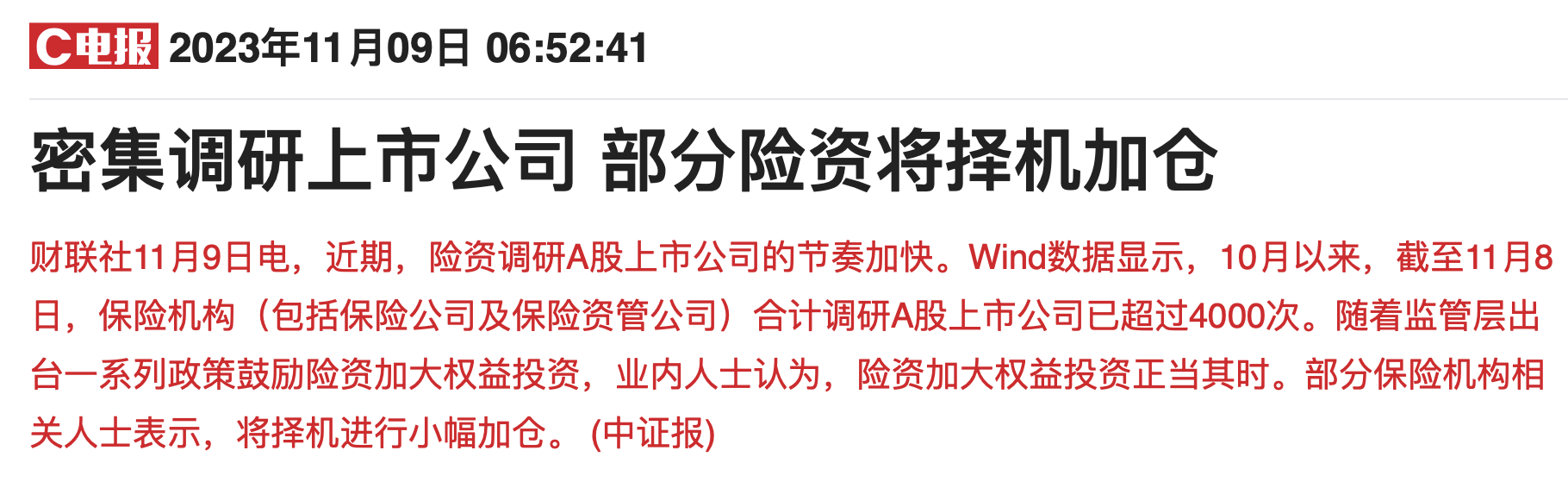 据媒体报道,险资近期调研A股上市公司的节奏加快。Wind数据显示,保险机构(包括保险公司及保险资管公司)10月以来合计调研A股上市公司已超过4000次。随监管层出台一系列政策鼓励,业内人士认为,险资加大权益投资正当其时。亦有保险资管公司坦言,近期有加仓计划。