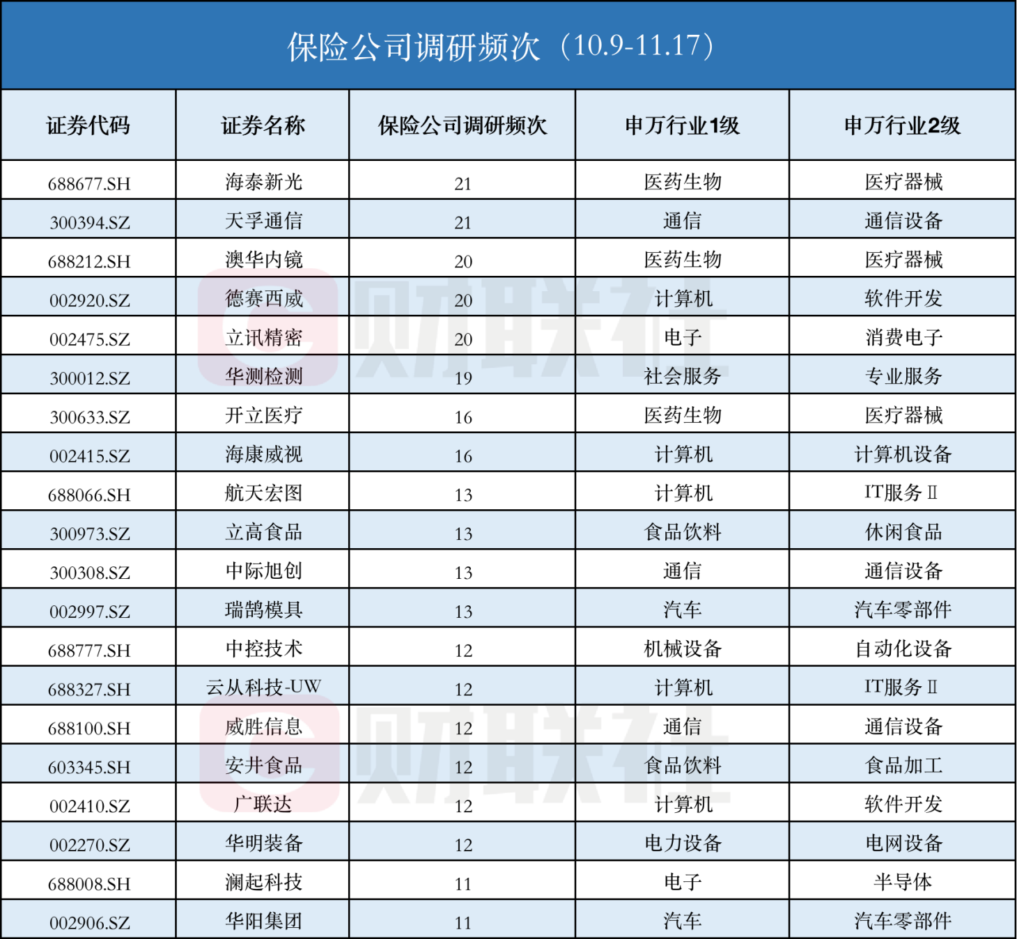 据Choice数据显示,自国庆节后首个交易日10月9日迄今,保险机构合计调研651家A股上市公司。其中,接待调研频次超10次的上市公司共有21家,分别为海泰新光、天孚通信、澳华内镜、德赛西威、立讯精密、华测检测、开立医疗、海康威视、航天宏图、立高食品、中际旭创、瑞鹄模具、中控技术、云从科技、威胜信息、安井食品、广联达、华明装备、澜起科技、华阳集团、普洛药业,具体情况如下图: