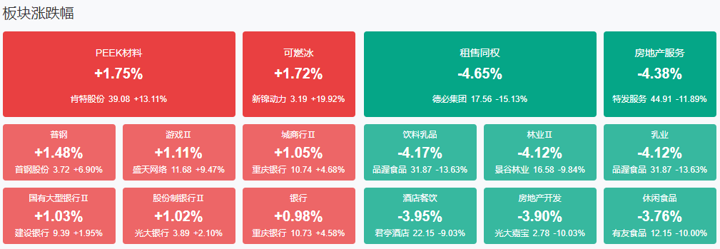 板块方面,PEEK材料、游戏、银行、钢铁等板块涨幅居前,海南、房地产、旅游、食品等板块跌幅居前。截至收盘,沪指跌0.2%,深成指跌0.62%,创业板指跌0.65%。