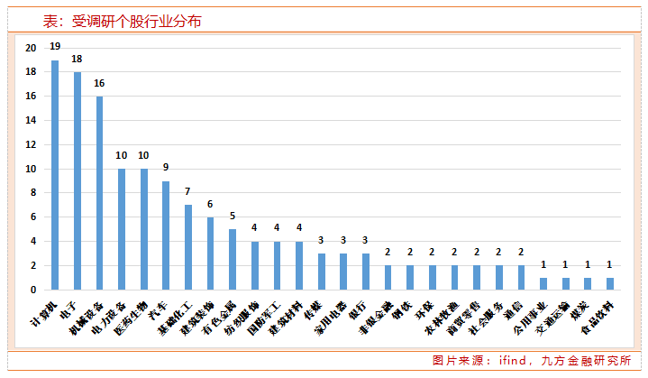 从行业分布来看,本期计算机行业获得最多关注,有19家上市公司接受调研;随后为电子、机械设备、电力设备、医药生物行业,均有超10家上市公司接受调研。