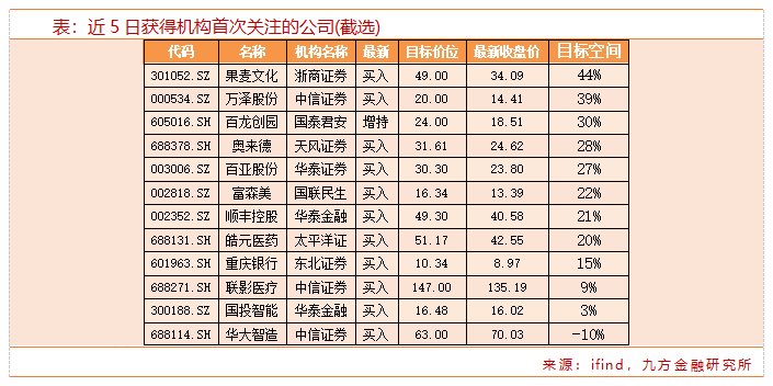 最新机构首次关注股票方面,近5日共有33份研报对上市公司进行首次覆盖。其中,12家获得明确的目标价格。