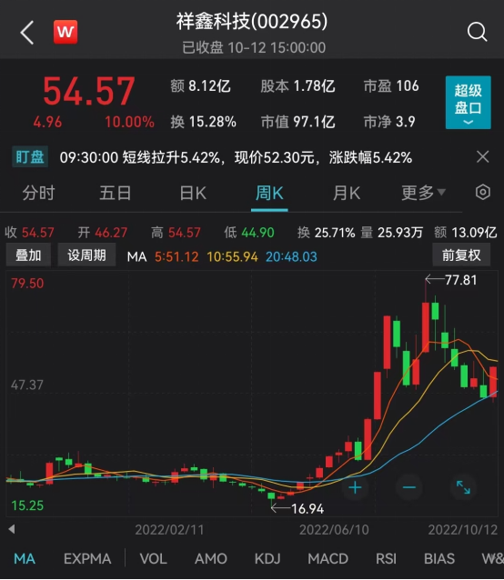 10月12日,祥鑫科技高开后一路震荡走高,午后强势上涨并再度封死涨停,最终收报54.57元/股,全天成交8.12亿元,换手率为15.28%,最新市值97.13亿元。过去两个交易日,该股连续涨停,累计上涨超两成。