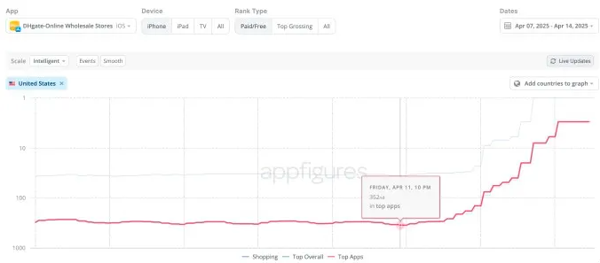 Appfigures的数据显示,上周六(4月12日),DHgate在苹果和谷歌应用商店的全球下载量达到了35400次,较30日均值增长56%。其中美国市场贡献了17300次的下载量,较30日均值激增98%。