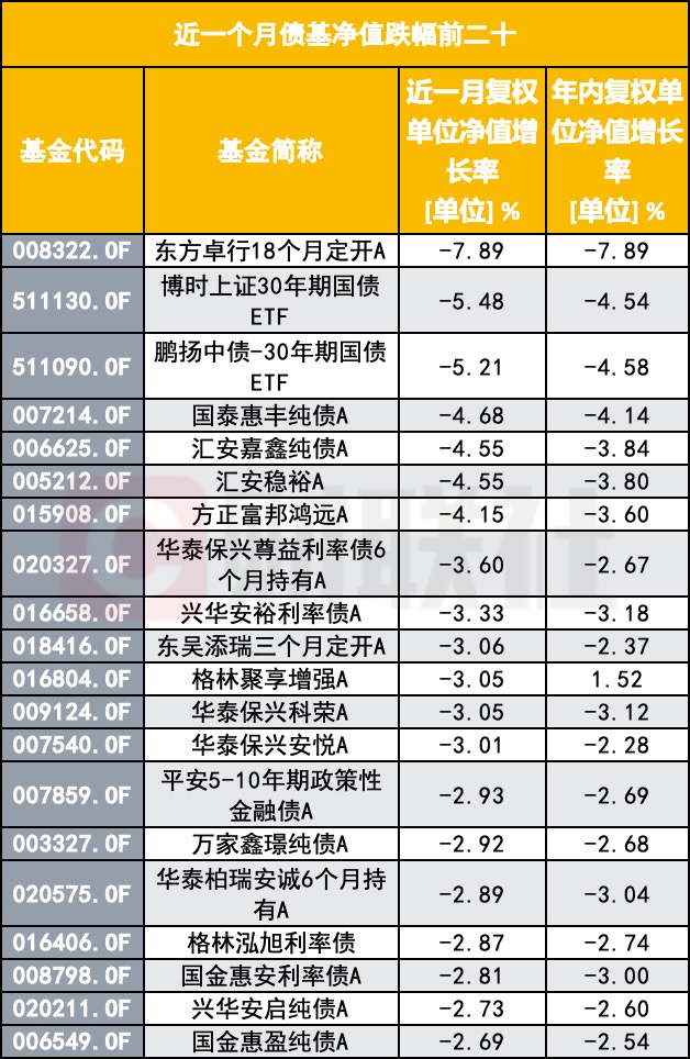 年内收益来看,上述提到的东方卓行18个月定开仍以下跌超7%居跌幅榜榜首,鹏扬中债-30年期国债ETF、博时上证30年期国债ETF、国泰惠丰纯债等年内净值跌幅超4%。