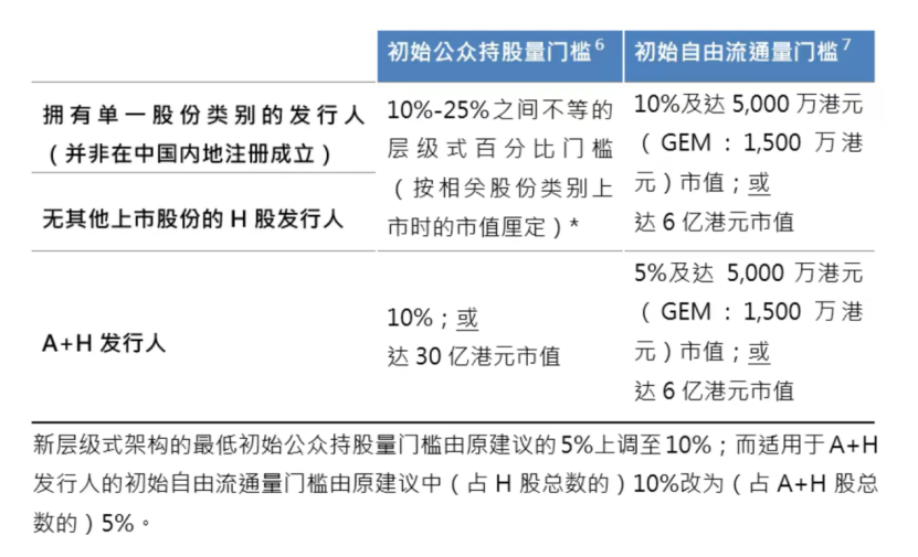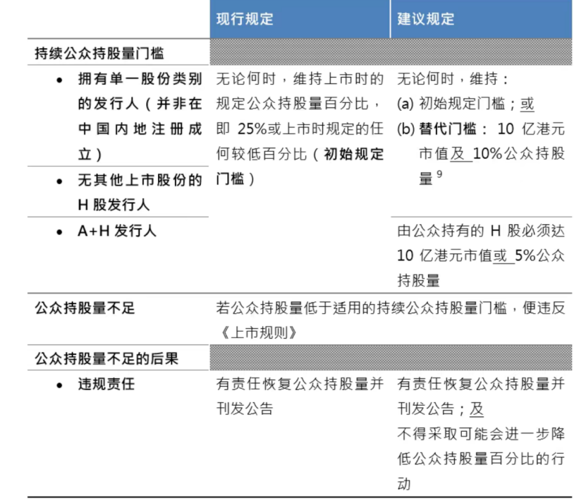 公开市场规定方面,主要变化是初始公众持股量及自由流通量的调整,规定发行人于上市时符合以下最低公众持股量及自由流通量规定。