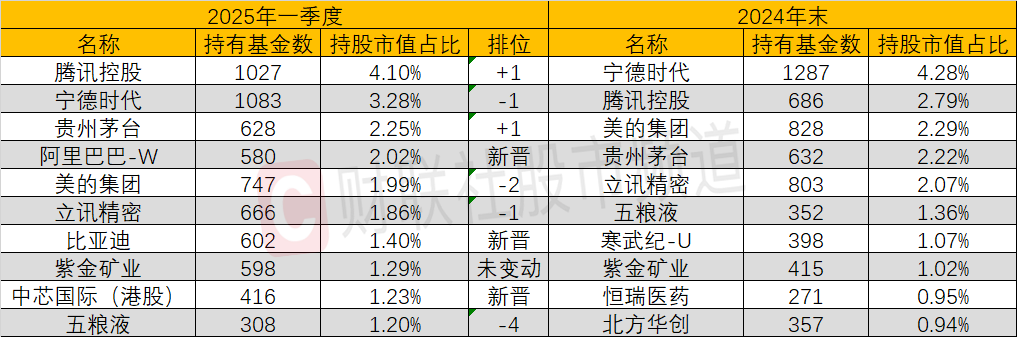 根据中国银河策略首席杨超的研报,与2024年末相比,一季度腾讯控股超越宁德时代,成为主动偏股型基金的第一大重仓股,此外阿里巴巴-W、中芯国际(港股)也跻身前十大重仓股行列。
