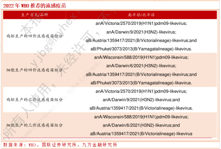 针对区域流行株的区别,世界卫生组织推荐 2022 年流感疫苗组分,22 年南北半球均以甲型流感中的 H1N1、H3N2 亚型,乙型流感中的 Yamagata、Victoria 谱系为主。四价疫苗增加乙流 Yamagata 系毒株的保护,适用于三岁以上的人群。