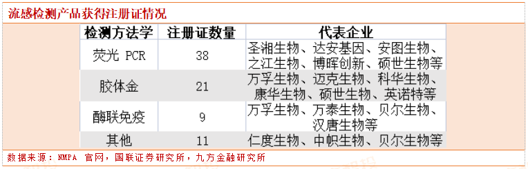 目前流感检测主要的方法包括荧光 PCR、胶体金等方法,截止 2023年3月5 日各类流感检测产品获得 NMPA注册证共79项,获注册证产品较多,我们预计对上市公司业绩贡献弹性较小。重点公司:安图生物、迈克生物、万孚生物、圣湘生物等。