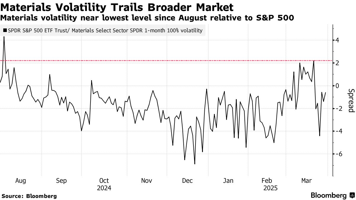 Stefano Pascale表示,原材料板块的预期波动率相较于标普500指数处于近二十年来的最低水平,这使得购买下行保护相对便宜;该板块的价格波动相较于更广泛的美国市场而言相对温和,尤其是与科技股相比。