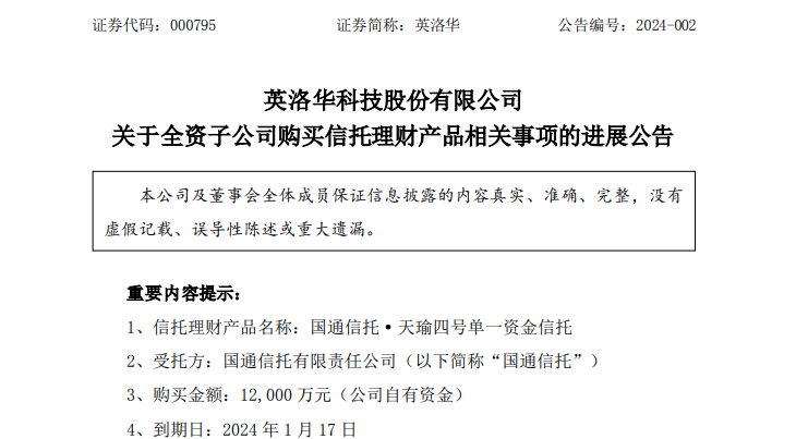 1月19日晚间,英洛华(000795)公告表示,全资子公司浙江联宜电机有限公司(简称“联宜电机”)购买的信托理财产品“国通信托·天瑜四号单一资金信托”,累计已收回436.92万元。