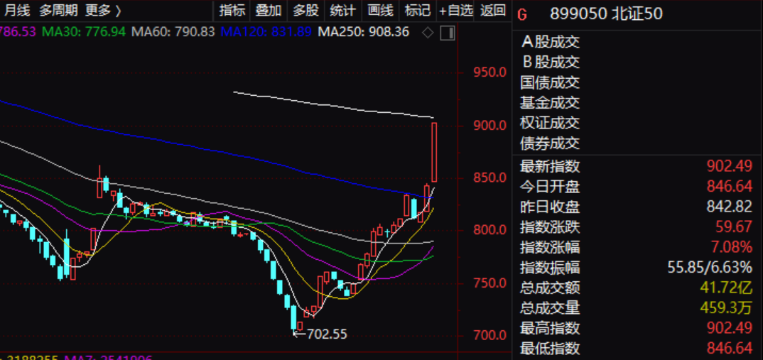其实,今天股市层面还有一个板块非常值得关注,那就是北交所的股票。今天早盘,北证50涨破900点整数关口,日内涨幅扩大至近7%,成交额超41亿元已创下历史天量,创逾4个月新高;星辰科技30cm涨停,恒进感应涨逾18%。近期,北证50指数涨势如虹,近一个月涨幅已经突破25%。