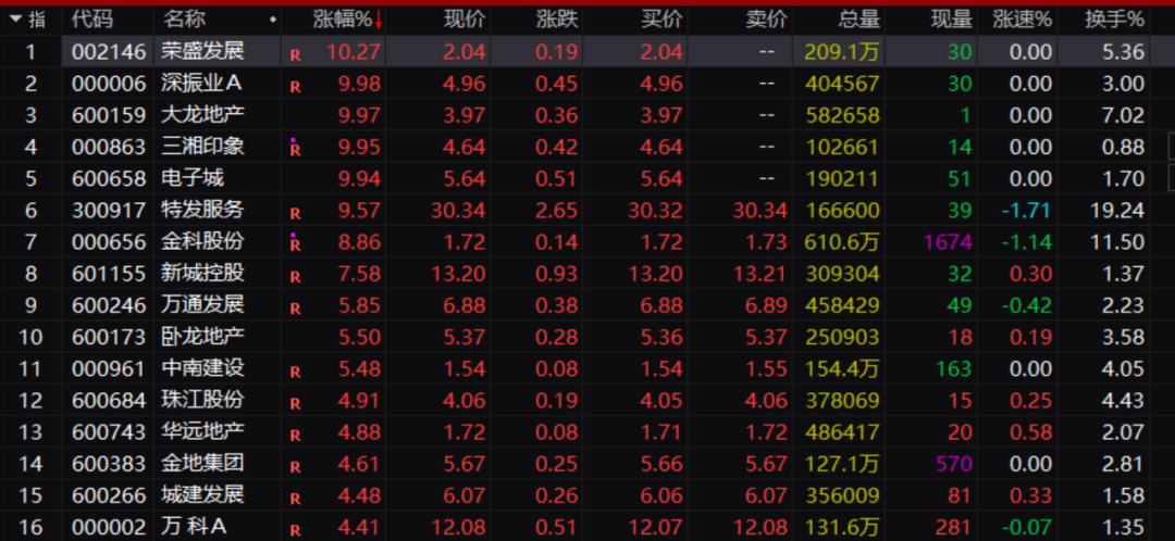 周二早盘,房地产板块全线大涨。A股涨幅超过10%的地产股一度达到了7只,而港股的弹性更大,融创中国一度涨超23%,新城发展涨超12%,中国恒大涨超11%。交易所地产债盘初更是大幅走高,“20龙湖04”涨逾8%,“21金地03”涨逾6%,“20龙湖02”涨逾4%,“22龙湖03”涨逾3%。
