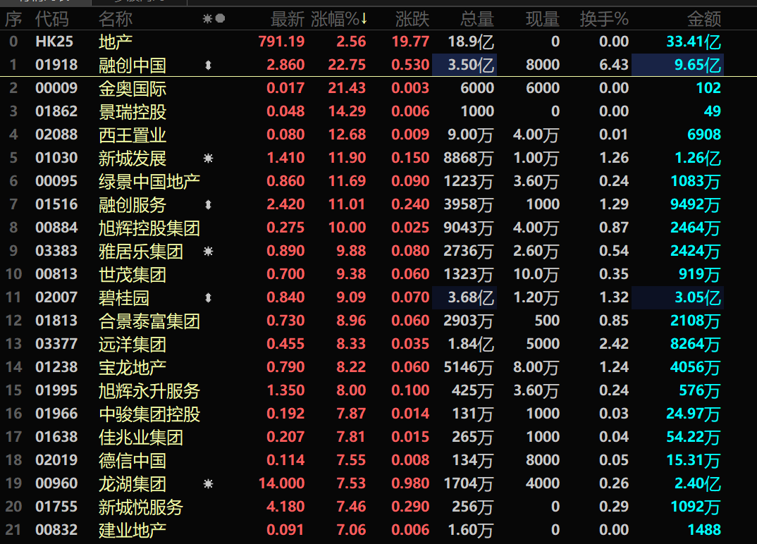 今天早盘,房地产板块集体狂欢。港股融创中国一度大涨超过20%,碧桂园、中国恒大、龙湖集团、万科企业等集体大涨。