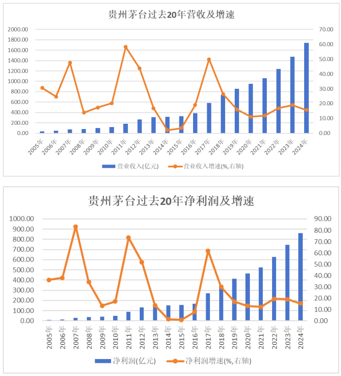 回溯历史,贵州茅台自2001年至2024年,贵州茅台连续24年营收、净利润持续增长,并成为白酒行业唯一超20年业绩持续增长的上市公司。