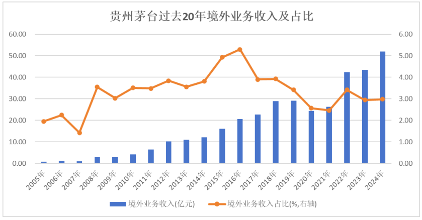 根据财务数据,贵州茅台早在上市次年(2002年)便开启出海之旅。近年来,公司不断优化出口产品结构,2024年高附加值茅台酒销量突破100吨,同比增长超40%;酱香系列酒销量150吨,同比增长30%。2024年公司境外收入突破50亿元的重要关口,达到51.89亿元,创历史新高;同比增长19.27%,增速较上一年增加超过15个百分点,且超过同期公司整体营收增速。2024年,公司境外收入占营业收入比重达到2.98%,较上一年小幅增加。